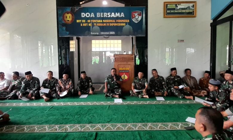 Patrazone.com – Dalam rangka menyambut Hari Ulang Tahun ke-80 Tentara Nasional Indonesia (TNI) dan HUT ke-75 Kodam IV/Diponegoro, Kodim 0736/Batang menggelar doa bersama di Masjid Baiturrahman, Kompleks Lapangan Tembak Para Duta Kodim 0736/Batang, Desa Tragung, Sabtu (4/10/2025).
