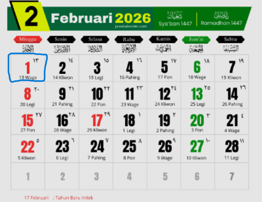 Patrazone.com — Hari ini, Minggu (1/2/2026) bertepatan dengan pasaran Wage dalam penanggalan Jawa. Berdasarkan perhitungan kalender Jawa, hari ini jatuh pada 13 Ruwah 1959, berada di Tahun Dal, Windu Sancaya, dan masuk Wuku Wuye.
